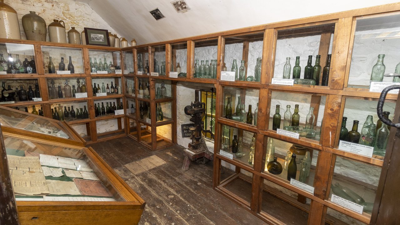 The Barn Museum: The large two storey barn, at the centre of a working hill-farm, exhibits implements and tools spanning 200 years of local farming history. An extensive and informative presentation of prints and photographs dating back to the time of the Famine, are also on display. The ground floor contains a fine collection of horse-drawn implements, from ploughs and harrows to carts and traps.Some excellent displays of farming tools as well as tools from the blacksmith’s, cartwright’s, thatcher’s and cooper’s trades are also presented.The Bottle Museum:The bottle museum was established in 1985 and holds a very large collection of antique 19th and early 20th century Irish bottles, jars and vessels, some of which were excavated on the farm.